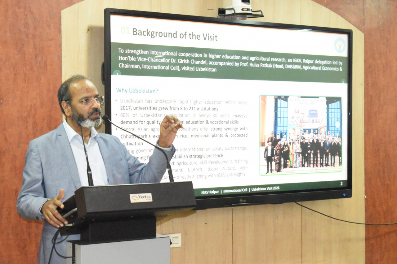 कृषि महाविद्यालय, इंदिरा गांधी कृषि विश्वविद्यालय, रायपुर में उज़्बेकिस्तान यात्रा के प्रमुख निष्कर्षों को साझा करने एवं अंतरराष्ट्रीय शैक्षणिक अवसरों को बढ़ावा देने के उद्देश्य से संगोष्ठी का आयोजन किया गया। यह कार्यक्रम विश्वविद्यालय के अंतरराष्ट्रीय शैक्षणिक सहयोग को सुदृढ़ करने के सतत प्रयासों का हिस्सा है।