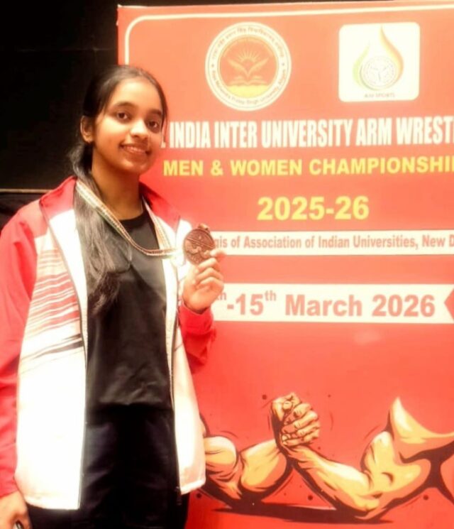 भिलाई नगर। शंकराचार्य विश्वविद्यालय जूनवानी भिलाई की छात्रा स्नेहा सिंह ने राजा महेंद्र प्रताप यूनिवर्सिटी अलीगढ़ उत्तर प्रदेश में आयोजित इंटर यूनिवर्सिटी आर्म रैसलिंग पुरुष एवं महिला चैंपियनशिप 2025-26 में कांस्य पदक जीतकर अपने विश्वविद्यालय शहर एवं राज्य को गौरवान्वित किया है। स्नेहा सिंह का राष्ट्रीय एवं अंतर्राष्ट्रीय स्पर्धा में यह 37 वा पदक है।