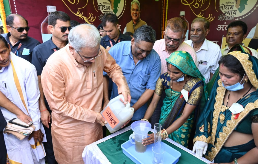मुख्यमंत्री श्री भूपेश बघेल ने पाटन विकासखण्ड के ग्राम करसा में हरेली के अवसर पर आयोजित कार्यक्रम में गौमूत्र खरीदकर दुर्ग जिले में गौ मूत्र खरीद योजना का शुभारंभ किया। मुख्यमंत्री ने ग्राम हसदा की महिला किसान राजेश्वरी वैष्णव, जानकी साहू से 5 लीटर गौमूत्र खरीदकर किसानों को 20 रूपए दिया। इसके पश्चात रिद्धि महिला ग्राम संगठन के महिला सदस्यों ने गौ मूत्र का रासायनिक परीक्षण किया। मुख्यमंत्री ने उनसे परीक्षण करने की प्रक्रिया की जानकारी ली।