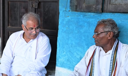 मुख्यमंत्री श्री बघेल ने किसान मोहन के घर कांसे की थाली में छत्तीसगढ़ का पारम्परिक भोजन कर रहे हैं