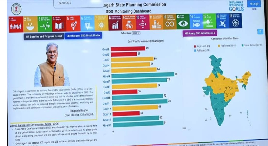मुख्यमंत्री श्री भूपेश बघेल ने आज यहां अपने निवास कार्यालय में राज्य योजना आयोग द्वारा सतत विकास लक्ष्यों की मॉनिटरिंग के लिए तैयार की गई ‘छत्तीसगढ़ एस. डी. जी. डिस्ट्रिक्ट प्रोग्रेस रिपोर्ट 2021’ का विमोचन किया एवं ‘एस. डी. जी. डैशबोर्ड’ लांच किया।