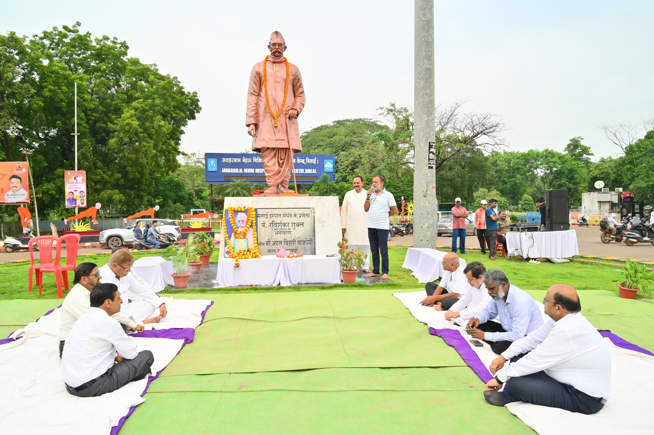 भिलाई /अविभाजित मध्य प्रदेश के प्रथम मुख्यमंत्री, स्वतंत्रता संग्राम सेनानी एवं जननेता स्व. पंडित रविशंकर शुक्ल की जयंती के अवसर पर 2 अगस्त, 2025 को भिलाई के सेक्टर-9 स्थित जवाहरलाल नेहरू चिकित्सालय एवं अनुसंधान केन्द्र, सेक्टर-9 के सम्मुख स्थापित पं. शुक्ल की प्रतिमा के समक्ष प्रातः 9.30 बजे एक भव्य समारोह का आयोजन कर स्मरण किया और बड़ी संख्या में जिला कांग्रेस के पदाधिकारियों, कांग्रेस सेवादल इस्पात नगरी के नागरिकों ने स्व. पं. रवि शंकर शुक्ल और स्व. पं. विद्याचरण शुक्ल के तैल चित्र पर पुष्प अर्पित कर पुष्पांजलि दी। शुक्ल जयंती समारोह के आयोजन में पूर्व केन्द्रीय मंत्री और प्रखर राजनेता स्व. विद्याचरण शुक्ल को भी उनके जन्म दिवस पर याद किया।