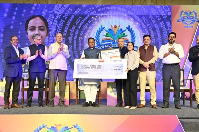 मुख्यमंत्री श्री विष्णु देव साय ने आज राजधानी रायपुर में आयोजित आईबीसी 24 स्वर्ण शारदा स्कॉलरशिप कार्यक्रम में 12वीं कक्षा की प्रवीण्य सूची में स्थान प्राप्त करने वाली प्रदेश की बेटियों को सम्मानित किया और उन्हें सहायता राशि के चेक प्रदान किए।