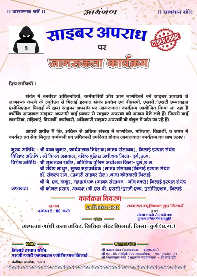 भिलाई /संयंत्र में कार्यरत अधिकारियों, कर्मचारियों और आम नागरिकों को साइबर अपराध से जागरूक करने के उद्देश्य से भिलाई इस्पात संयंत्र प्रबंधन एवं बीएसपी, एससी/एसटी एम्पलाइज एसोसिएशन भिलाई के द्वारा साइबर अपराध पर जागरूकता कार्यक्रम आयोजित किया जा रहा है क्योंकि आजकल साइबर अपराधी कई प्रकार से साइबर अपराध को अंजाम देने लगे हैं। जिससे कई नागरिक, महिलाएं, विद्यार्थी, कर्मचारी, अधिकारी साइबर अपराधी के चंगुल में फंस जा रहे हैं। साइबर अपराध पर एक जागरूकता कार्यक्रम डिजिटल दुनिया में सुरक्षित रहने के लिए व्यक्तियों और संगठनों को शिक्षित करने का एक महत्वपूर्ण प्रयास है। इसका उद्देश्य ऑनलाइन खतरों के बारे में समझ बढ़ाना, सुरक्षित प्रथाओं को बढ़ावा देना और साइबर हमलों से बचने के लिए आवश्यक ज्ञान प्रदान करना है। महात्मा गांधी कला मंदिर, सिविक सेंटर भिलाई, जिला-दुर्ग (छ.ग.) में बुधवार को संध्या 5 बजे से कार्यक्रम प्रारंभ होगा कार्यक्रम प्रारंभ होने के पूर्व तथागत म्यूजिकल ग्रुप द्वारा सुगम संगीत प्रस्तुत किया जाएगा | साइबर अपराध से नागरिकों को सुरक्षित रहने के लिए पुलिस प्रशासन एवं विशेषज्ञओ की टीम द्वारा इसकी जानकारी दी जायेगी |