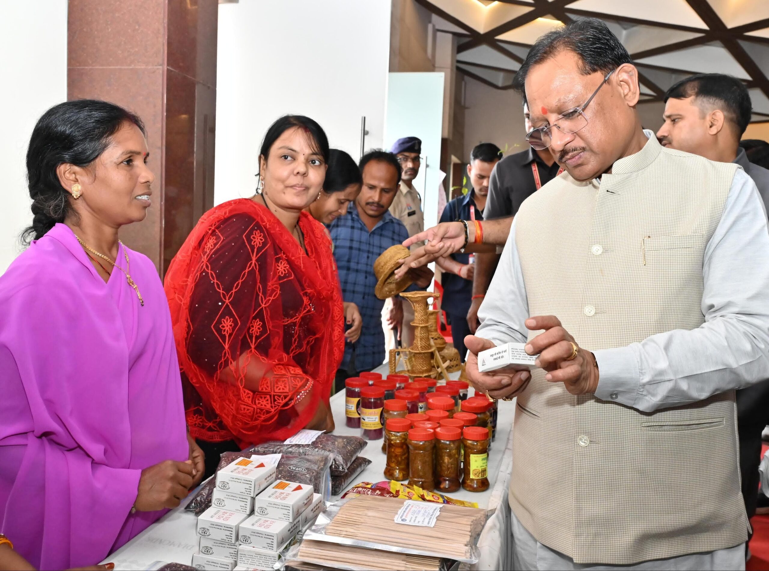 मुख्यमंत्री श्री विष्णु देव साय ने शहीद स्मारक भवन परिसर में पॉलिसी वॉच इंडिया फाउंडेशन द्वारा लगाए गए बिहान दीदियों के स्टॉलों का अवलोकन किया। उन्होंने विभिन्न स्व-सहायता समूहों की महिलाओं से चर्चा कर उनके उत्पादों और आजीविका गतिविधियों की जानकारी ली।