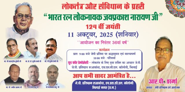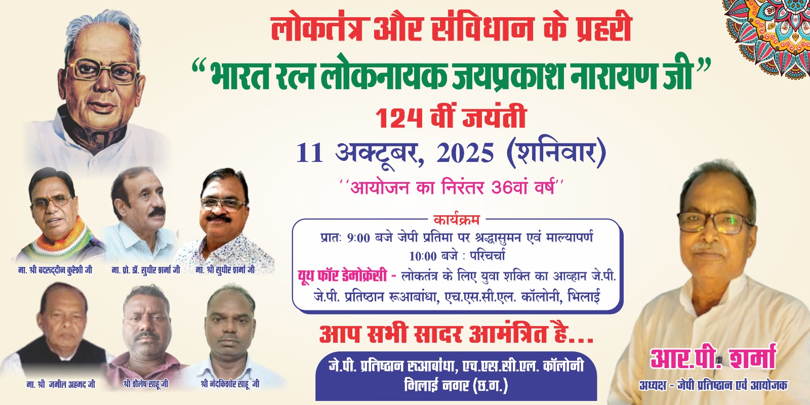 भिलाई। भारत रत्न लोकनायक जयप्रकाश नारायण की 124वीं जयंती पर श्रद्धांजलि सभा एवं परिचर्चा का आयोजन 11 अक्टूबर शनिवार को रखा गया है। भारत रत्न लोकनायक जयप्रकाश नारायण स्मारक प्रतिष्ठान एचएससीएल कॉलोनी रूआबांधा की ओर से आयोजित कार्यक्रम में सुबह 9:00 बजे सेक्टर 6 व 2 के मध्य स्थित जेपी चौक पर श्रद्धांजलि सभा होगी। जिसमें जेपी प्रतिमा पर श्रद्धा सुमन एवं माल्यार्पण किया जाएगा। वहीं एचएससीएल कॉलोनी रूआबांधा में सुबह 10:00 बजे से परिचर्चा का आयोजन किया गया है। जिसका विषय ‘यूथ फॉर डेमोक्रेसी लोकतंत्र के लिए युवा शक्ति का आह्वान जेपी’ रखा गया है। जेपी प्रतिष्ठान के अध्यक्ष आर पी शर्मा ने बताया कि आयोजन के मुख्य अतिथि प्रोफेसर डीएन शर्मा होंगे। वहीं अध्यक्षता छत्तीसगढ़ शासन के पूर्व राज्य मंत्री बदरुद्दीन कुरैशी करेंगे। प्रमुख वक्ता प्रोफेसर डॉक्टर सुधीर शर्मा, विशेष क्षेत्र विकास प्राधिकरण (साडा) के पूर्व उपाध्यक्ष बृजमोहन सिंह, श्रमिक नेता प्रभुनाथ मिश्रा और वरिष्ठ अधिवक्ता जमील अहमद होंगे। समाजवादी जनता पार्टी (चंद्रशेखर) छत्तीसगढ़ के महासचिव नंदकिशोर साहू ने इस अवसर पर उपस्थिति की अपील की है।