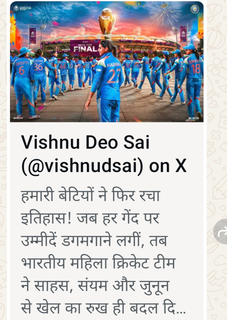 मुख्यमंत्री श्री विष्णु देव साय ने टीम इंडिया को इस शानदार उपलब्धि पर बधाई देते हुए कहा कि यह जीत देश के हर नागरिक के लिए गर्व का क्षण है। हमारी बेटियों ने साहस और अनुशासन से विश्व पटल पर भारत का परचम फहराया है। फाइनल मुकाबले में हम सबकी शुभकामनाएँ उनके साथ हैं।